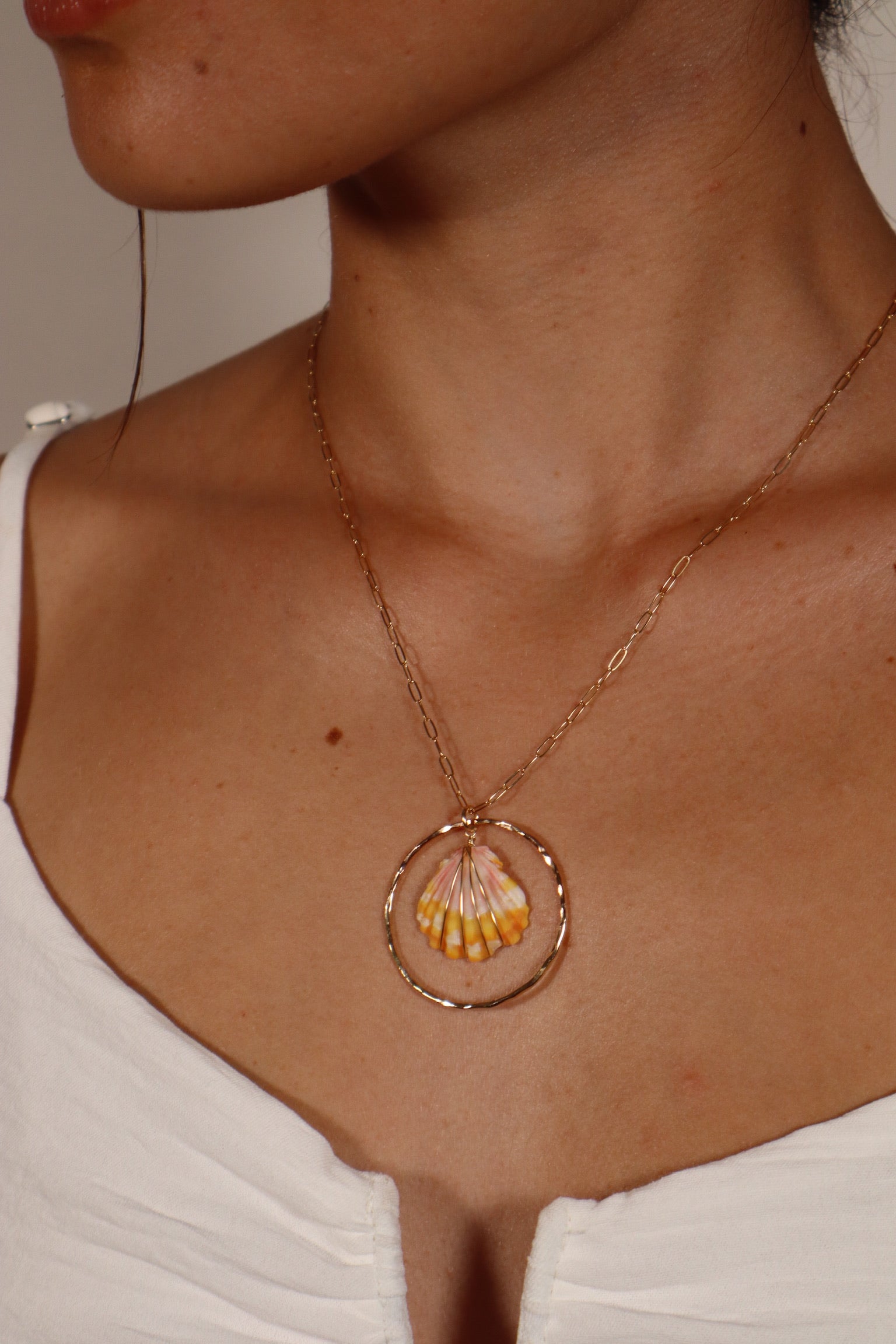 This necklace features a sunrise shell from Hawai`i, framed in a hammered 14K gold-filled circle and hung on a delicate chain. The shell’s radiant hues of pink, orange, and yellow evoke the warmth of a rising sun over island waters, making it a true treasure of the sea.
